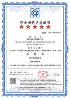 在服务体系建设方面,创新推出STAR星光服务体系,致力于为业主提供卓越的物业服务体验,持续追求服务品质的极致化,注重服务细节的精细化管控,确保各项服务均符合高标准与高质量要求。以“行于至善,南光同行,臻诚护航”为核心理念,南光服务构建“星·客服”、“星·环境”、“星·安全”、“星·工程”及“星·运营”五大服务体系,严格执行服务标准与质量管控流程。通过优化环境管理机制、强化员工职业健康保障等多维提升举措,系统化塑造南光服务品牌形象,着力打造行业领先的物业运营平台。同时,积极引入内地及澳门权威机构的ISO认证体系,以系统化提升服务品质。